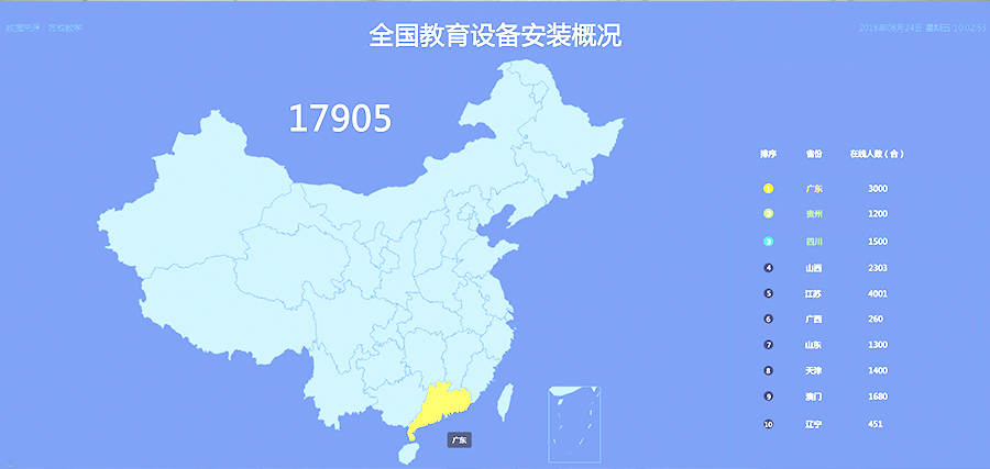 設備集控軟件,用於教學設備的班、校、縣、市、區、省的逐級管理。教育部門可以通過設備集控軟件中的設備地圖查看本地區所