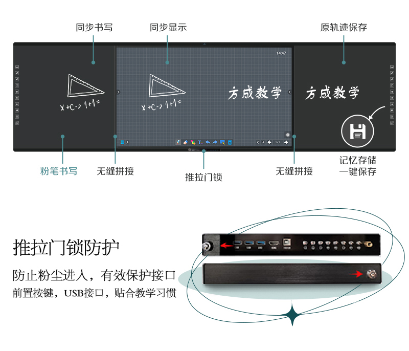 機身保護——獨特的推拉門鎖設計,保護前置按鍵及接口,還能收納白板筆和教鞭;